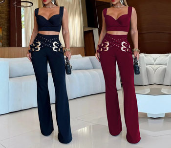 ZHEZHE, venta al por mayor, camisetas sin mangas con sujetador y pantalones acampanados de cintura alta con botones, conjunto Sexy de 2 piezas para mujer, ropa de club nocturno